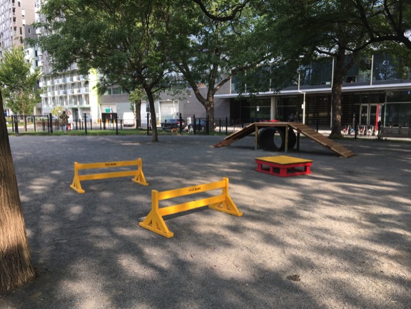 In our initial project, the agility course proposed by dog trainer Jean Lessard was made up of already existing urban elements such as concrete blocks, bike path markers, tires, etc. but the elements that make up the agility course chosen by the City are mainly made of wood and they are very popular with users.