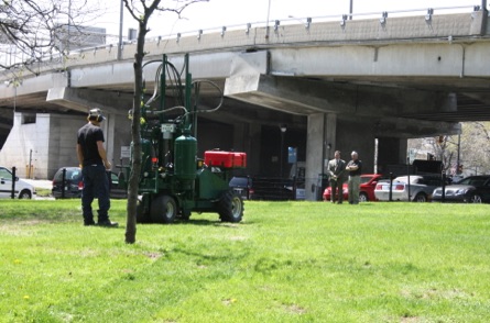 Despite the constant efforts of watering of Britney and Alain Farag, Per Dahl and other hardworking volunteers, and the addition of clover seeds, the grass did not survive in the large section of the park.