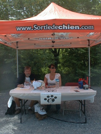 Signature of petition. Maurice Cusson is with Charlemagne, under the table and Julie Carle is with Starlette, on the table, all dressed for the cause.
